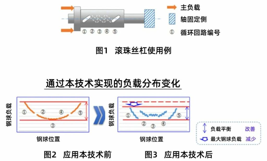 当滚珠丝杠所受的负载变大时,各循环回路所承受的负载将变得不均衡(图2)。由于个别循环回路中的钢球所承受的负载过高,从而导致滚珠丝杠的使用寿命降低。NSK通过独有的高精度加工技术(专用加工机的开发)、解析技术(数字孪生技术的使用)和精密测量技术(通过与加工数据的联动提高测量精度),开发出了一种滚珠丝杠的长寿命化技术,可实现各循环回路的负载分布最优化,降低钢球的最大负载,从而达到以往产品的最长2倍运行寿命(图3)。